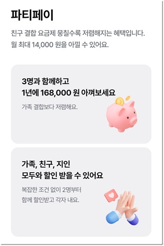파티페이는 친구 또는 지인과 함께 뭉치면 할인을 받을 수 있는 혜택입니다. 3명이 최대며, 월 최대 14,000원을 할인받을 수 있습니다. 꼭 가족이 아니어도 모르는 사람과도 결합할 수 있습니다.