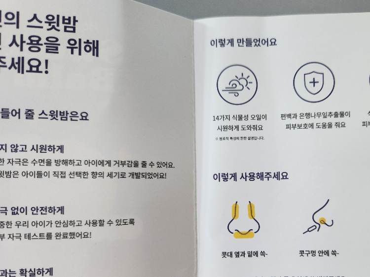 잠잘때 코막힘 하우스윗 스윗밤을 스윽~ 코 옆에~ 코 밑에도요. 가슴쪽에 발라주면, 아로마테라피 느낌도 난다고 합니다. 아로마테라피 느낌은 엄마가 받으면 되겠네요~ ㅎㅎ 그리고 잠잘때 코막힘 하우스윗 스윗밤은 내성이 생기지 않아 하루에 2~3번 발라줘도 괜찮다고 합니다. 단 피부가 연약한 아이들은 주의하셔야 할듯합니다.